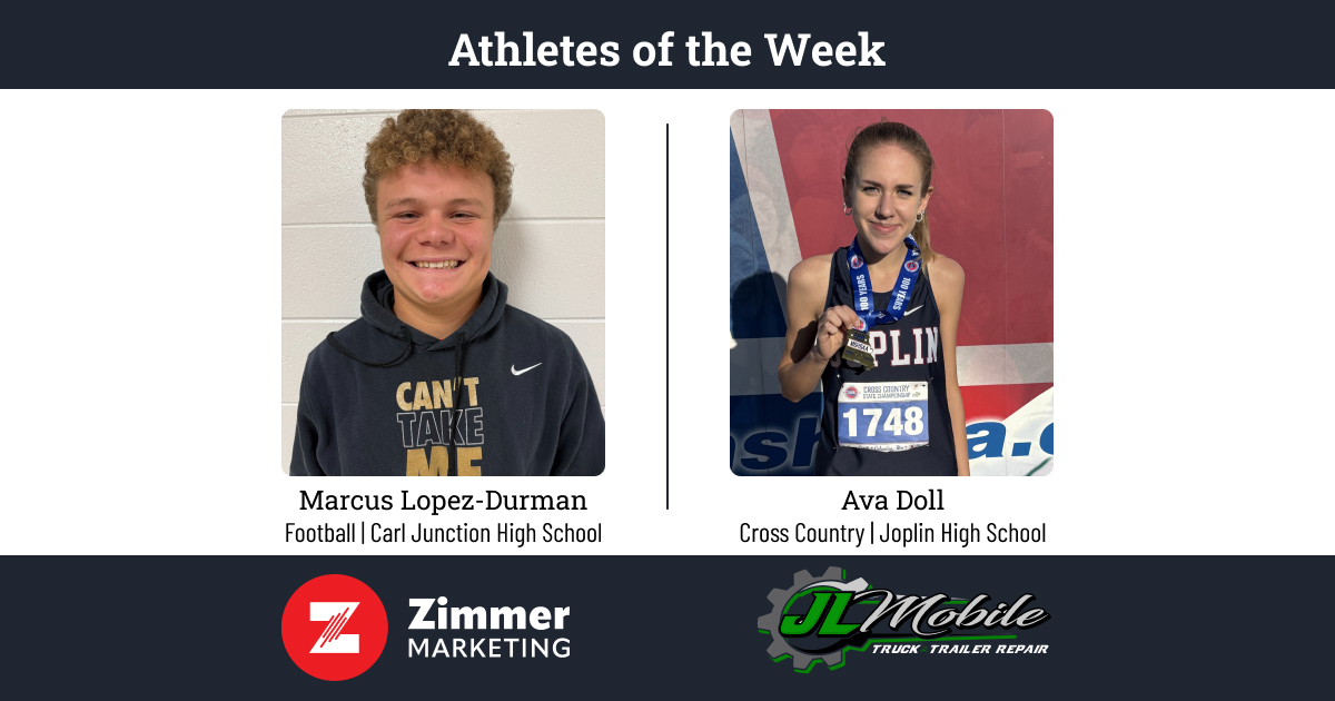 Carl Junction running back Marcus Lopez-Durman and Joplin cross country runner Ava Doll have been chosen as this week’s Zimmer Marketing’s Male and Female Athletes of the Week brought to you by JL Mobile Truck and Trailer Repair.