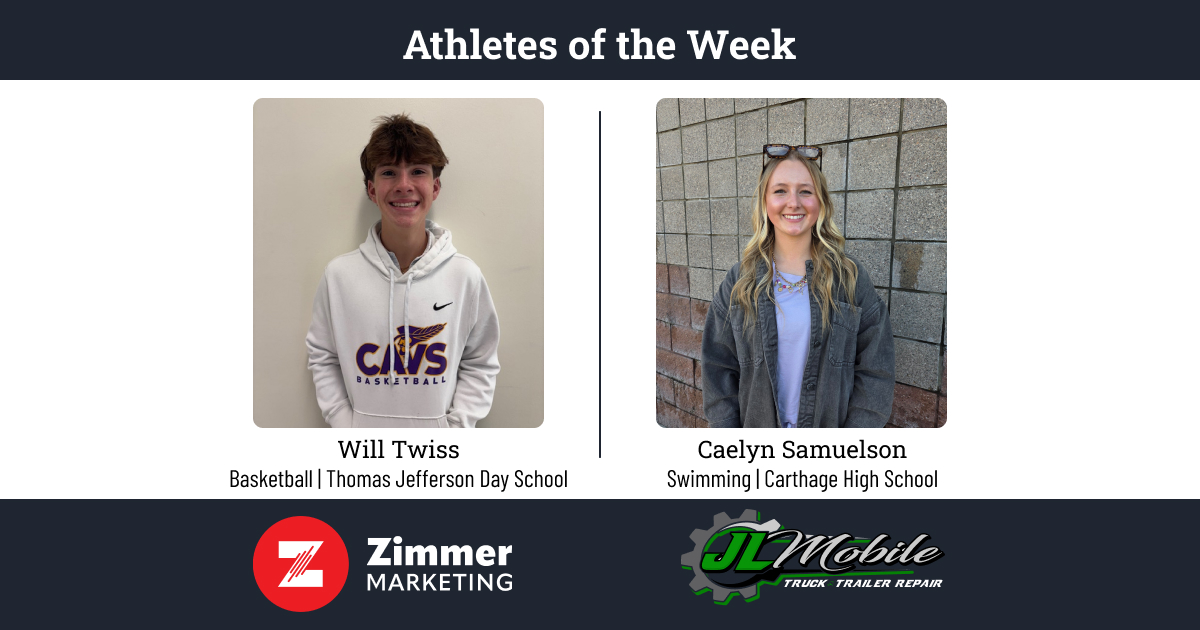 Carthage swimmer Caelyn Samuelson and Thomas Jefferson basketball player Will Twiss have been named the Zimmer Marketing Female and Male Athletes of the Week brought to you by JL Mobile Truck and Trailer Repair.