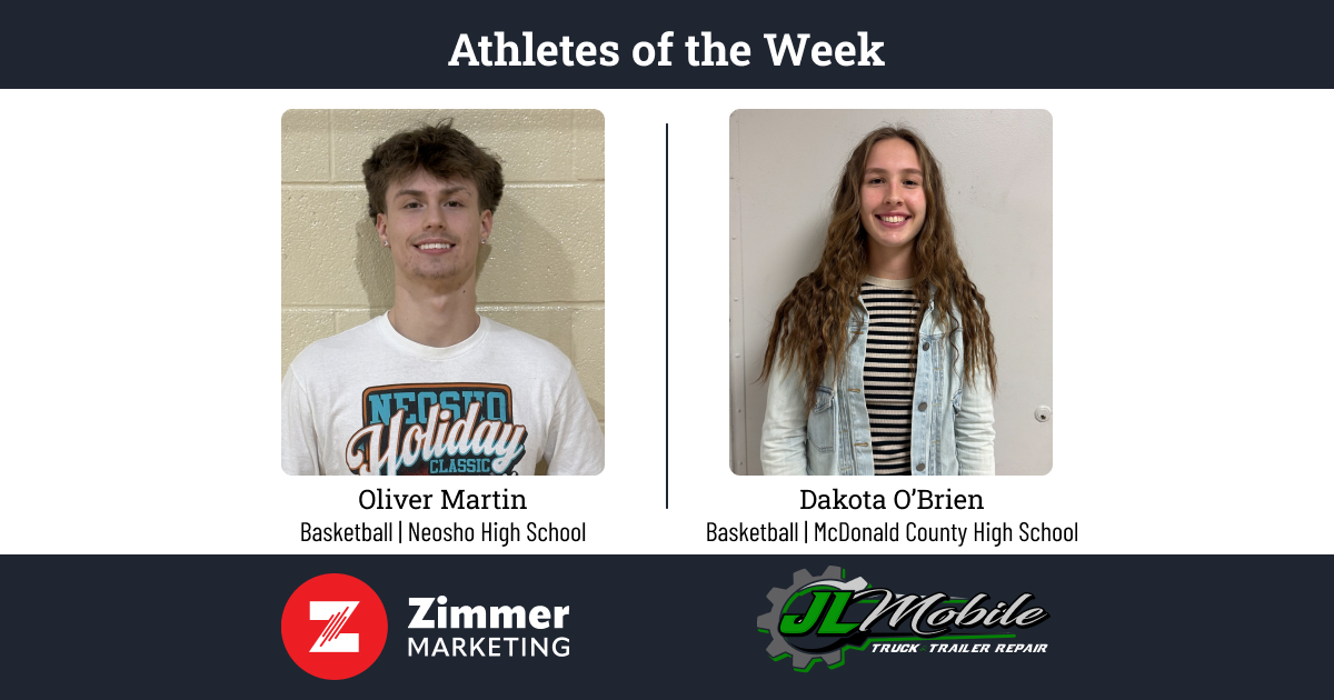 McDonald County girls basketball player Dakota O’Brien and Neosho boys basketball Oliver Martin have been named the Zimmer Marketing Female and Male Athletes of the Week brought to you by JL Mobile Truck and Trailer Repair.