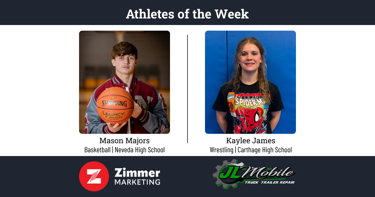 Carthage wrestler Kaylee James and Nevada basketball player Mason Majors have been named the Zimmer Marketing Female and Male Athlete of the Week brought to you by JL Mobile Truck and Trailer Repair.